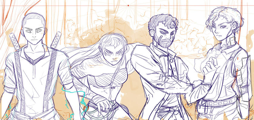 Nesse, eu farei uma illustração renderizada completa, na qual os personagens interajem com o cenário de alguma maneira. Temos iluminação, dinamismo e cenários mais complexos, além de outros